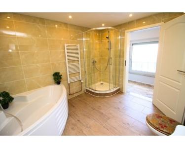 -Badezimmer mit Badewanne und Dusche sowie separates Gäste-WC