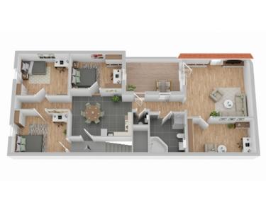 Ein besonderes Highlight ist die großzügige Terrasse, die sowohl über den Flur als auch direkt vom Wohnzimmer aus zugänglich ist – ideal für entspannte Sommerabende mit Familie oder Freunden.