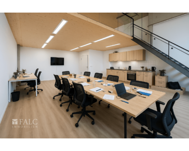 Die Bürofläche befindet sich in einem modernen Loftdesign mit hohen Decken. Wände und Decke sind in Sichtbeton ausgeführt, die Beleuchtung ist in die Betondecke integriert. Der Bodenbelag besteht aus pflegeleichtem und strapazierfähigem Vinyl.