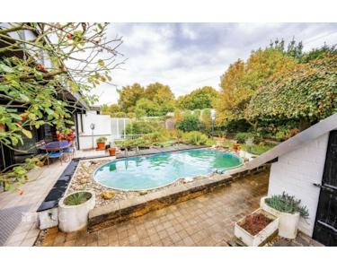 Der Außenbereich besticht durch einen liebevoll angelegten Garten, der viel Platz zum Spielen und Entspannen bietet. Ein Pool lädt an heißen Sommertagen zur Abkühlung ein. Weiterhin befinden sich im Garten ein Abstellraum sowie ein, am Ende des Grundstückes, gebauter Weinkeller.