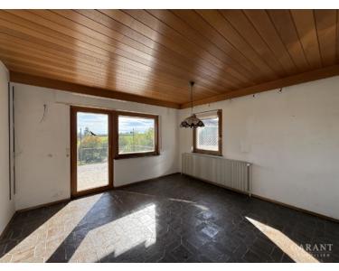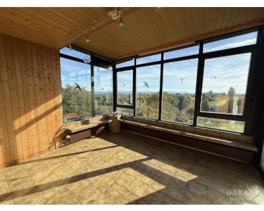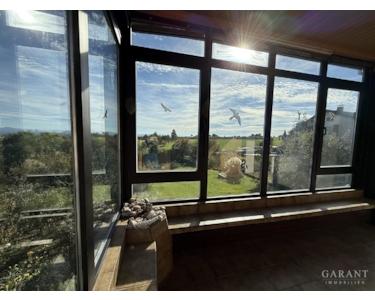 Im Erdgeschoss erwarten Sie ein helles Wohnzimmer und ein offener Essbereich mit direktem Zugang sowohl zum Wintergarten als auch zur Terrasse perfekt, um den herrlichen Ausblick und die Natur zu genießen. Zudem befinden sich auf dieser Ebene eine Küche, ein Schlafzimmer und ein separates WC.
