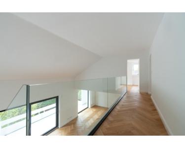 Über die elegante Galerie erschließen sich die übrigen Wohnräume. Drei stilvolle Zimmer bieten vielseitige Nutzungsmöglichkeiten – als Kinder-, Gäste- oder Arbeitsbereiche – und vereinen Komfort mit Rückzugsmöglichkeit. Ein weiteres hochwertig ausgestattetes Vollbad rundet die zweite Ebene ab. Hier erwarten Sie eine freistehende Badewanne, eine moderne Regendusche sowie elegante Unterputz-Armaturen und großformatige Fliesen, die den luxuriösen Gesamteindruck unterstreichen.