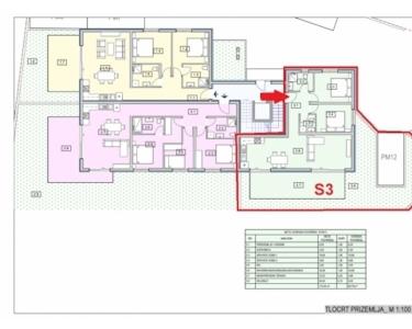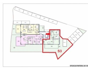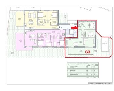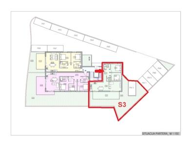 Die zum Verkauf stehende Wohnung (TS-S3) befindet sich im Erdgeschoss des Gebäudes. Sie besteht aus zwei Schlafzimmern, Flur und Eingangsbereich, Wohnküche, einem Badezimmer, einem WC, einer 23,53 m² großen Terrasse und einem 84,54 m² großen Garten. Zur Wohnung gehört ein Stellplatz. Die Gesamtfläche beträgt 187 m².