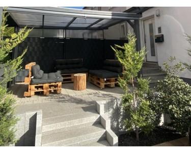 Die Fassade wurde gestrichen und der Außenbereich neu gestaltet samt überdachtem Freisitz.