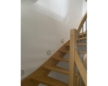 Auch die Bodenbeläge wurden erneuert. Im Erdgeschoss sowie im Mittelgeschoss wurden hochwertige Natursteinfliesen verlegt, im Obergeschoss Echtholz-Parkett. Eine massive Echtholz-Treppe verbindet die Stockwerke.