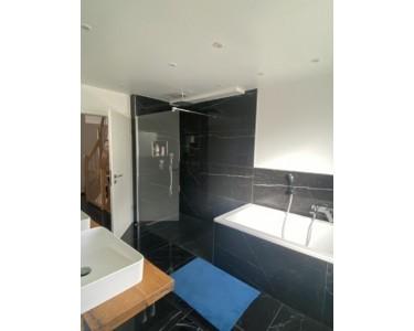 Die Bäder und das Gäste-WC wurden ebenfalls saniert. Das Bad im Mittelgeschoss überzeugt mit übergroßer, ebenerdiger Regendusche und einer großen Badewanne.