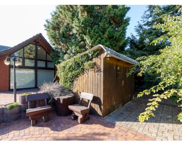 Der Garten ist ein Ort zum Verweilen. Die große, uneinsehbare Grünfläche eröffnet zahlreiche Gestaltungsoptionen – von blühenden Beeten über Gemüseanbau bis hin zu Spiel- und Rückzugsflächen für die ganze Familie. Ein Gartenhaus nebst Schuppen und Geräteraum fügen sich harmonisch in das Grundstück ein und bieten praktischen Stauraum für Fahrräder, Geräte und alles, was man im Alltag gerne griffbereit hat.