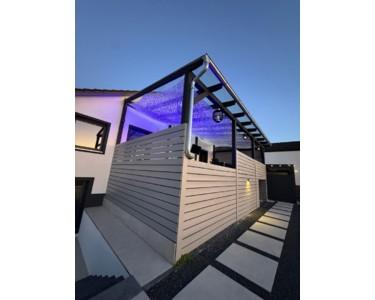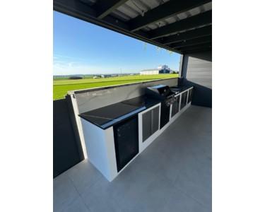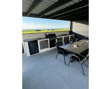 - Outdoor-Küche mit Weber-Grill, Spülbecken mit Warmwasser, Kühlschrank mit Beleuchtung, Steckdosen, Rollos, Glasabtrennungen und Beleuchtung.