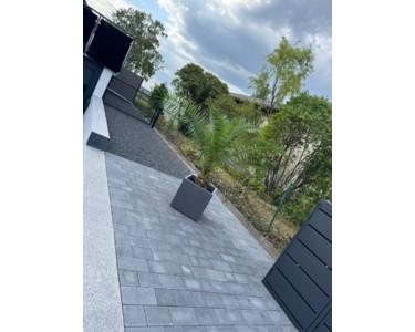 - Komplett gestaltete Außenanlage: Mauer, Zaun, 90x90 cm Terrassenplatten, App-gesteuerte Hausbeleuchtung in verschiedenen Farben, zahlreiche Stellplätze, Mülltonnenverkleidung, Geländer aus Stahl mit schwarzem Glas.