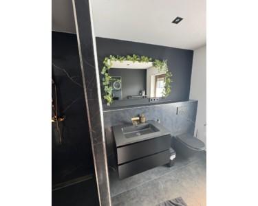 - Zwei luxuriöse Bäder (Master- und Gästebad) mit 3D-Wandfliesen in Schwarz-Gold, Whirlpool-Badewanne mit Bluetooth und Spiegel mit Wetteranzeige.