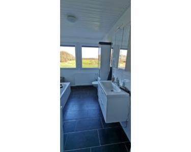Die OG-Wohnung ist hell und großzügig gestaltet und verfügt über einen separaten Eingang mit eigenem Garten. Die weißen Einbauschränke in der Diele bieten reichlich Stauraum. Als Bodenbelag wurden in einem der Zimmer, sowie in der Küche und der Diele weiße Fliesen verlegt. Des weiteren ist Laminat verlegt worden. Auf den zwei großzügigen Loggien mit Ost- und Westausrichtung kann die Morgen- bzw.. die Nachmittagssonne genossen werden. Das neue Bad hat eine bodenebene Dusche, Badewanne,Waschbecken und Toilette. Ebenso wurde das Gäste-WC und die Fenster erneuert.