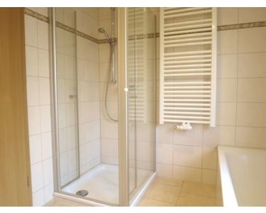 Das schicke, hochwertig ausgestattete modernisierte Badezimmer verfügt über eine Badewanne, einen beheizbaren Handtuchhalter, eine Dusche mit Glaskabine, ein Waschbecken mit modernen Badezimmerschränken. Hier wurden moderne, helle Wand- und Bodenfliesen verwendet. Ein großes Fenster bietet Ihnen reichlich Tageslicht.