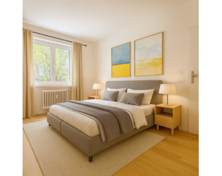 Hier können Sie Ihren Blick in den wunderschönen grünen Vorgarten genießen. Das mit Auslegeware versehene Schlafzimmer liegt am Ende der Diele und ist ca. 15,12 m² groß und bietet einige Möglichkeiten, sich optimal einzurichten. Die Küche ist mit einer Einbauküche ausgestattet und verfügt über einen Herd inkl. Backofen und einen Kühlschrank. Das Tageslichtbad mit Wanne wurde modernisiert und mit einer modernen Handtuchheizung ausgestattet. Highlight der Wohnung ist der praktische Grundriss. Letzte Renovierung 2023. Es handelt sich beim Schlafzimmer um ein maßstabsgetreues Foto, das mit KI bearbeitet wurde. So oder ähnlich könnte der Raum nach erfolgreicher Renovierung und mit neuer Ausstattung aussehen.