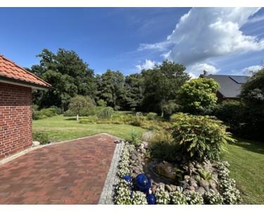 Der liebevoll angelegte Garten ist eine Oase der Ruhe: mit Terrasse, Bachlauf und Teich – ein perfekter Rückzugsort für Naturliebhaber.