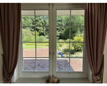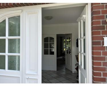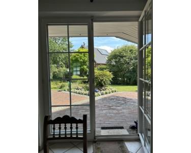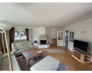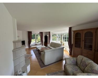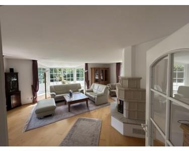 Von hier aus gelangen Sie in das Wohnzimmer mit Kamin, das mit seinem Ahornparkett und dem Blick ins Grüne ein besonderes Wohlfühlambiente schafft.