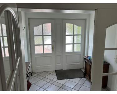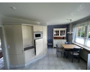 Die große Einbauküche mit erneuerten Bosch-Geräten lädt zum gemeinsamen Kochen und Verweilen ein und bietet Platz für einen Esstisch. Der einladende Flur mit Garderobe führt in die lichtdurchflutete Diele, die durch ihre Großzügigkeit und den weiten Blick in den Garten besticht – ideal für gesellige Runden und Familienfeiern.