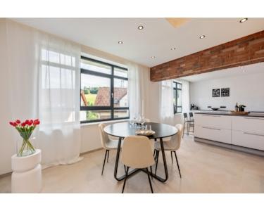 Das Herzstück ist der großzügige Wohn-/Essbereich mit Loft-Charakter, der mit indirekter Beleuchtung, digital gesteuerter Fußbodenheizung und edlen Materialien punktet. Die bodentiefen Panoramafenster eröffnen einen beeindruckenden Blick ins Grüne und lassen den Raum mit Licht durchfluten – echtes Loft-Gefühl inklusive.