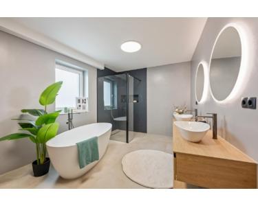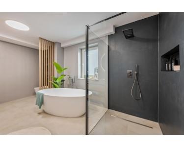 Das luxuriöse Badezimmer mit freistehender Badewanne, Walk-in-Dusche und Design-Elementen macht jeden Tag zum kleinen Wellness-Ritual.