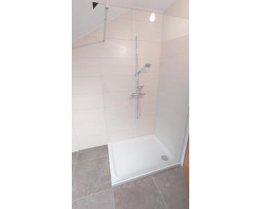 - Badezimmer mit moderner Dusche und Fliesenboden