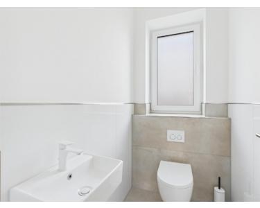 Ein Gäste-WC sowie ein praktischer Hauswirtschaftsraum mit Anschlüssen für Waschmaschine und Trockner ergänzen das Erdgeschoss.