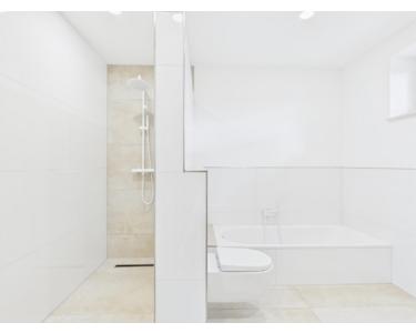 Das Obergeschoss bietet drei gut geschnittene Schlafzimmer und ein hochwertig gestaltetes Badezimmer in moderner Optik – ausgestattet mit bodengleicher Dusche, großem Waschtisch und edlen Armaturen.