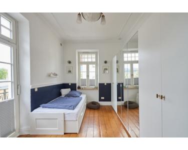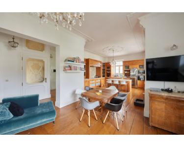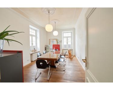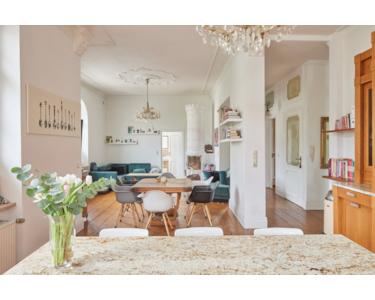 Eingebettet in einen herrlichen Garten, führt der wunderschöne Eingang in das große, einladende Treppenhaus, mit noch originalen Holztreppen/Holzgeländer. Es ist mit aufwendigen Stuckelementen geschmückt. Jeder Raum erzählt durch Stuckverzierungen eine Geschichte.