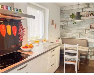 Die moderne Einbauküche, die im Haus verbleibt, ist ebenfalls ein Pluspunkt: Sie ist funktional ausgestattet und gepflegt. Derzeit ist die Küche geschlossen und über den Flur erreichbar – auf Wunsch lässt sich die Wand zwischen Küche und Wohnzimmer problemlos entfernen, sodass ein offener, großzügiger Wohn- und Kochbereich entsteht.