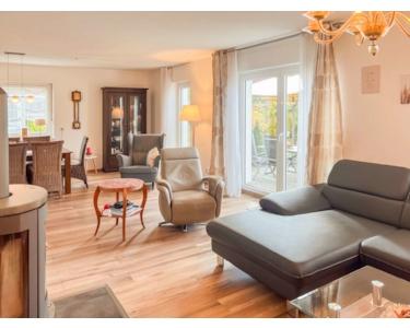 Schon beim Betreten beeindruckt der großzügige Empfangsbereich im Erdgeschoss. Von hier aus gelangt man in das helle, freundliche Wohnzimmer mit Zugang zur Terrasse.