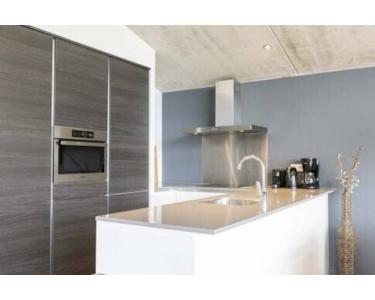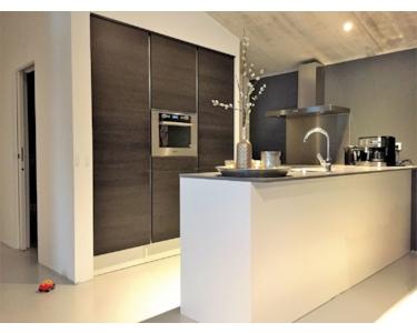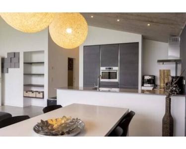 Im Essbereich finden Sie einen großen Esstisch sowie die grifflose Designküche mit Insel und allen Standard-Einbaugeräten (Geschirrspüler, Mikrowelle, Kühlschrank mit Gefrierfach, Induktionskochfeld) der Marke Bauknecht. Außerdem sind eine Kaffeemaschine, ein Wasserkocher und ein Toaster vorhanden.