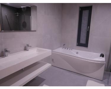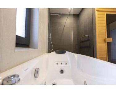 Das große, sehr geräumige Badezimmer verfügt über eine Whirlpool-Badewanne, eine bodengleiche Dusche, eine Infrarot-Sauna und ein breites Waschbecken mit zwei Armaturen.
