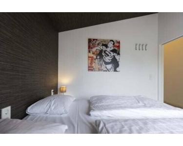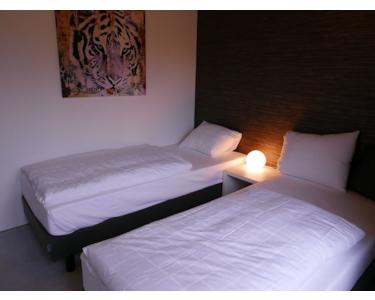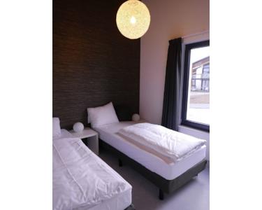 Das letzte Schlafzimmer liegt ebenfalls an der Vorderseite. Auch hier stehen zwei Einzelbetten, die sich zu einem Doppelbett verbinden lassen, mit Nachttisch und einer integrierten Schrankwand.