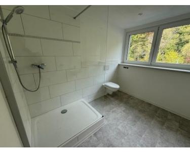 Gemeinschaftsflächen: Flur (Laminat hell, 7,4 m²/3 = 2,4 m²), Gemeinschaftsbad mit großer Dusche, WC und Doppelwaschbecken, elektr. Rolläden, sowie einem der Wohnung zugeteilten Badezimmerschrank (PVC hell, 8,5 m²/3 = 2,8 m² ),