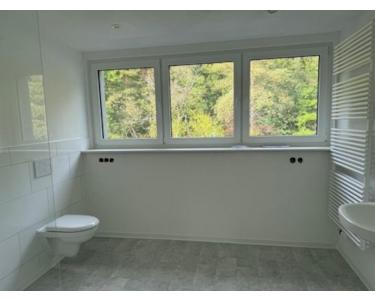 Die Wohnung befindet sich im Dachgeschoß am Hang und bietet mit den großen Kippfenstern (elektr. Rolladen) den weiten Blick über Bad Bocklet auf die gegenüberliegenden Hänge.