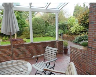 Die Immobilie beeindruckt durch ihre große überdachte Terrasse inkl. Markise mit Blick in den schönen Garten.