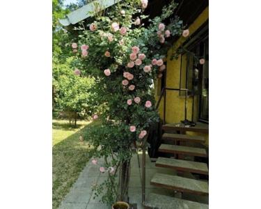 * Außenbereich & Garten: große Wiese, Obstbäume (Äpfel-, Süß- und Sauerkirsche, Pflaume), mehrere Weinstöcke (blau), Brombeerhecke und Beerensträucher, großzügige Terrasse mit natürlichem Sichtschutz durch Rosen, Sträucher, Jasmin und Bäume, Schuppen für Feuer- und Kaminholz sowie Gartengeräte