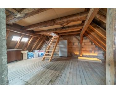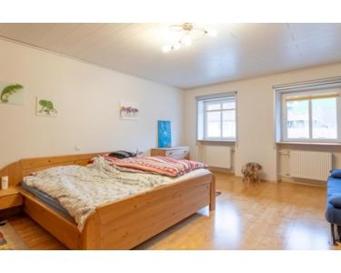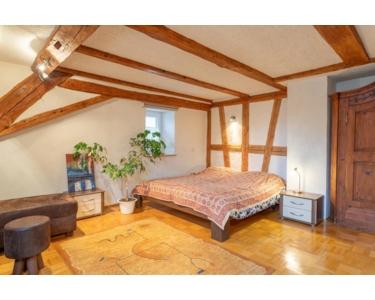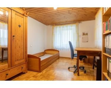 Über das Treppenhaus gelangt man in das Obergeschoss mit zwei Schlafzimmern, einem großen Wohnzimmer, einer derzeit als Waschküche genutzten Küche sowie einem separaten Trakt mit Bad und WC. Im ausgebauten Dachgeschoss stehen zwei großzügige Schlafzimmer zur Verfügung, eines davon mit eigenem Bad.