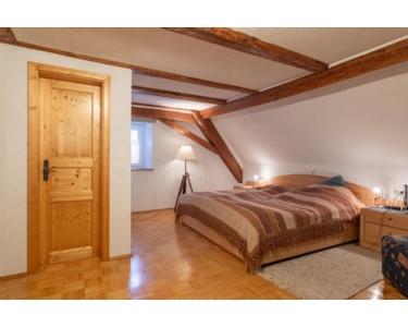 Im ausgebautem Dachgeschoss befinden sich zwei große Schlafzimmer, die durch offene Balkendecken und Holzböden eine warme, wohnliche Atmosphäre im Schwarzwald-Stil vermitteln. Eines der Schlafzimmer verfügt über ein eigenes Bad mit WC und Dusche, ideal als Gästezimmer nutzbar.