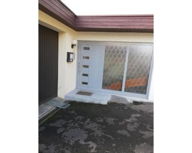 Im Erdgeschoss befindet sich ein geräumiges Wohnzimmer mit zwei Schiebetüren, die nahtlos in das Esszimmer übergehen – ideal für gemeinsame Familienessen. Ebenfalls im Erdgeschoss finden sich ein Arbeitszimmer, ein Bad mit Dusche, eine Küche, ein Gäste-WC und ein großzügiger Garderobenbereich. Die Fenster im Erdgeschoss sind entweder doppelt verglaste Kunststofffenster oder doppelt verglaste Holzfenster mit Aluminiumprofil.