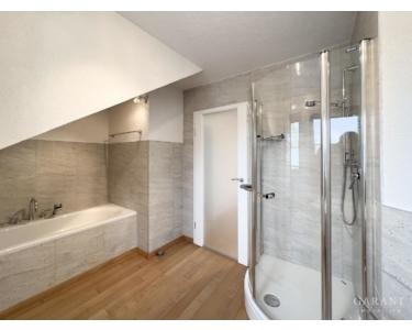 Die Wohnung im Obergeschoss erstreckt sich über zwei Ebenen und überzeugt mit einem modernen Grundriss sowie lichtdurchfluteten Räumen. Das Dachgeschoss wurde im Jahr 2002 vollständig ausgebaut, somit beherbergt die Wohnung zwei stilvolle Badezimmer, eines davon komplett neuwertig. Besonders hervorzuheben sind die beiden Balkone, die herrliche Rückzugsorte im Freien bieten. Mit ihrer offenen Gestaltung und der neuen Einbauküche präsentiert sich die Wohnung im Obergeschoss in einem absolut neuwertigen Zustand und wurde bislang nicht bewohnt.
