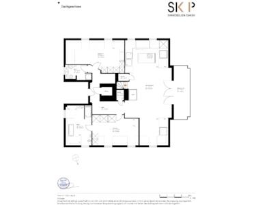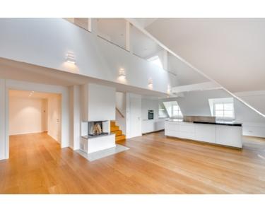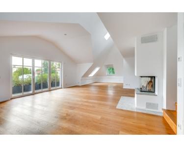 deren klare Linien mit den dynamischen Wandschrägen kontrastieren. Der dezent in die Wand eingelassene Treppenaufgang neben dem Kamin führt auf die Galerie und einen weiteren Raum im Dachgeschoss, der vielfältige Nutzungsmöglichkeiten bietet. Als ein Highlight des Penthouses darf die sonnige Süd-Dachterrasse gelten, die wie eine Erweiterung des Wohnbereiches wirkt und eine Oase der Ruhe bildet. Von hier kann der Blick in das herrlich grüne, ruhige Wohngebiet schweifen, während die Bewohner selbst blickgeschützt sind. Eine Speise-, eine Abstell- sowie eine Garderobenkammer komplettieren das Raumangebot. Zu der Wohnung gehören zudem zwei Tiefgaragen-Stellplätze sowie ein großer Kellerraum.