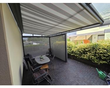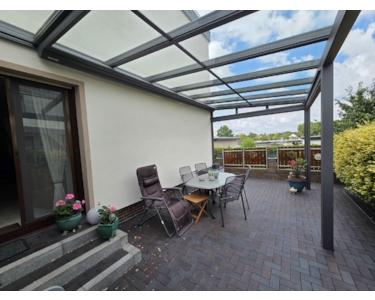 Die 30 m² große Terrasse wurde 2021 überdacht mit elektrischer Markise und 2 elektrischen Windfängen. Die Terrasse, Wege ums Haus und die Auffahrt wurden im Jahr 2011 neu gepflastert und im Frühjahr 2025 gereinigt und imprägniert; die Außenanlagen sind pflegeleicht angelegt.