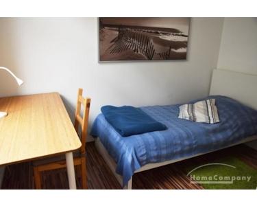 Arbeits/Schlafzimmer mit Einzelbett 100x200 cm und Tisch/Schreibtisch, Kleiderschrank, Laminat.