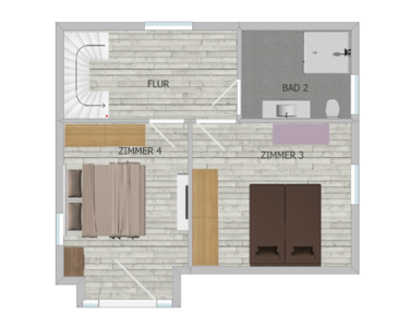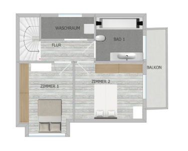 Im Dachgeschoss befinden sich ein zweites Bad mit Wanne, 2 Schlafräume, wovon einer Zugang zu einem Sonnenbalkon hat, sowie ein Raum, welcher als Waschraum genutzt werden kann.