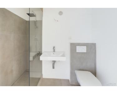 Das stilvolle Badezimmer ist mit einer modernen Duschkabine ausgestattet und rundet das zeitgemäße Wohnkonzept ab.