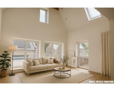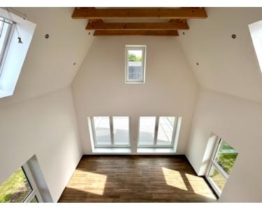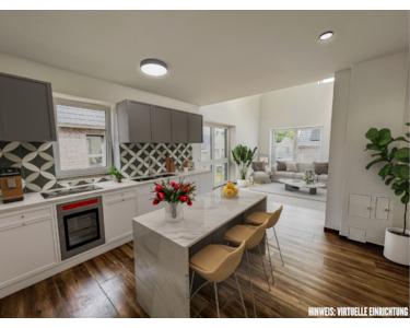 Im offenen Wohn,- Koch- und Essbereich des Erdgeschosses erwartet Sie ein besonderes Raumgefühl durch die großen Fensterfronten und den Luftraum mit Blick bis unters Dach.
