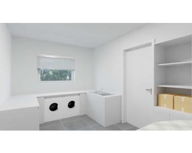 Praktisch ist der sich daran anschließende große Hauswirtschaftsraum, in dem Sie Ihre Waschmaschine und Ihren Trockner anschließen können.