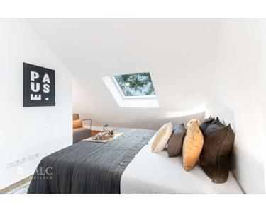 Im Obergeschoss befinden sich zwei großzügige, lichtdurchflutete Zimmer sowie ein modernes Badezimmer mit Badewanne und Dusche. Ein separater Hauswirtschaftsraum mit Waschmaschinenanschluss sorgt für praktischen Alltagskomfort. Das Dachgeschoss beherbergt das großzügige Schlafzimmer mit Bad en Suite – ein echtes Highlight, das auch bei Mietinteressenten für Begeisterung sorgt.