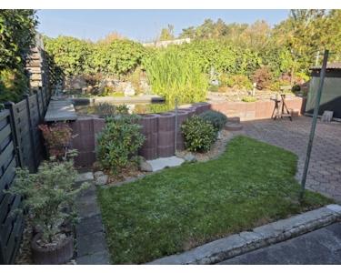Zum Verkauf steht ein gemütliches Reihenendhaus mit Grünfläche vor dem Gebäude und einem Garten mit einer Teichanlage im Innenhof.