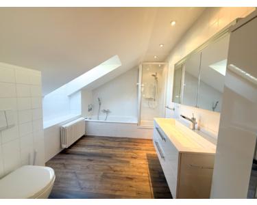 • EG: geräumiges Wohnzimmer im Split Level mit Ausgang Terrasse, sep. Küche mit hellen Einbauten und E-Geräten, Abstellraum, Gast-WC
