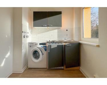 - Wohnzimmer mit Kochnische: Ausgestattet mit einer modernen Pantryküche inklusive Waschmaschine.